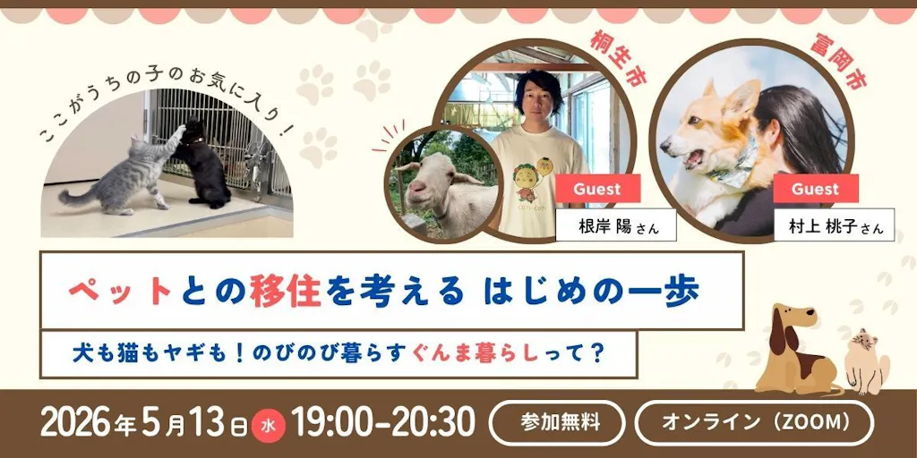 【5月13日(水)19:00~|オンライン開催】「ペットとの移住を考える、はじめの一歩『ここがうちの子のお気に入り!』 犬も猫もヤギも!のびのび暮らすぐんま暮らしって?」
