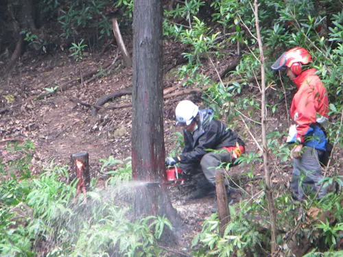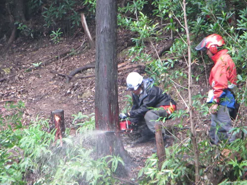 チェーンソーを使った森林整備や伐採など、現場でしっかり働く仕事です。