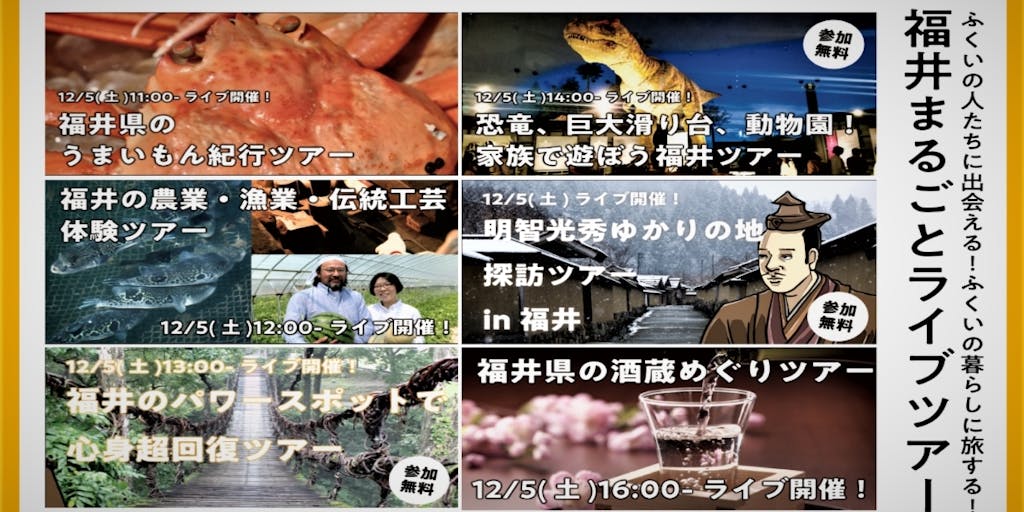 2020/12/05(おそらく)史上初、1日で福井の全市町を巡る「福井まるごとLIVEツアー!」 福井のグルメ、風景、歴史、しごとなど、ありのままの福井が体感できます。 このツアーに参加すれば、福井に来たことがない人も福井を満喫できるはず! 案内人は地域おこし協力隊や地域で活動するいろんな人たち。 自分が暮らす地域でぜひ紹介したいという場所を、生放送でご紹介します!!