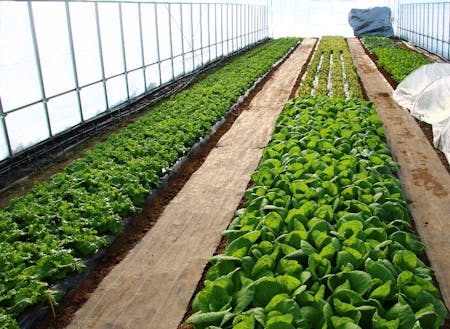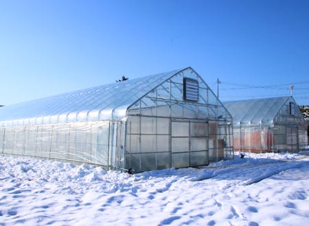 ・村内での施設園芸(ハウス)栽培実証 村内にある小学校グラウンド跡地に新設された園芸施設(ビニールハウス)で、10月頃から1月頃まで葉物野菜(レタス等計6品目)の栽培を行い、2月頃から10月頃まで、イチゴ(4品種)の栽培を行います。