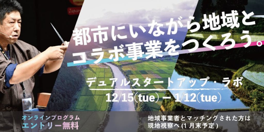 2021/03/01▼プログラムについて 都市圏に拠点を置きながら、高知県の地域事業者と連携して事業を行う「デュアルスタートアップ」を目指すプログラムです! 全3回のオンラインプログラムを通して、地域内事業者がもっている課題やお題に、あなたのアイディアやプロジェクトを組みあわせて新規事業アイデアを作っていきます。 オンラインで地域事業者とコミュニケーションをとりつつ、最後には現地へ訪れて実際に仮説検証を行うことができます。 「スタートアップ」となっていますが、個人でのプロジェクトなどももちろん大歓迎! 既に皆さんがお持ちの事業からこれからはじめたいプロジェクトまでコラボ提案もOKです。 地域内事業者からのお題に対してアイデアを提案しましょう。