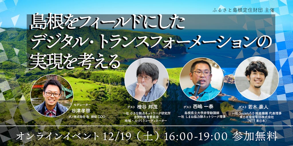 2020/12/19当イベントでは実際にご活動されているゲストを招いて具体的な事例について取り上げながら、企業として地域と取り組める活動をイメージできる機会をつくりたいと考えています。 島根県の各地域と連携してデジタル・トランスフォーメーションの実現に興味のある企業の皆様、ぜひご参加ください。