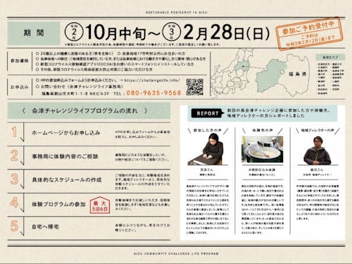 2021/02/12地域ディレクター(地元に精通したコーディネーター)が、参加者の会津での移住体験をコーディネートします。 参加者は専用サイトで訪れたい市町村や体験プログラム(古民家ゲストハウスの運営、農業体験ほか多数)を記載し、それをもとに地域ディレクターがお一人おひとりに応じたチャレンジライフをコーディネートします! 会津チャレンジライフ専用サイト:http://challengelife.info/ 参加者は、希望するプログラムを体験するだけではなく、地域ディレクターや地元の方々との交流も楽しむことができます。
