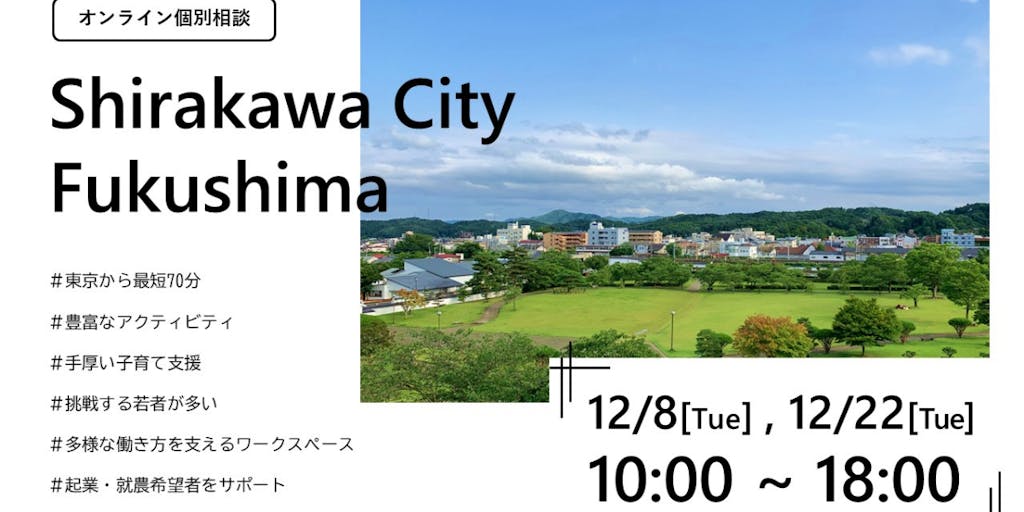 2020/12/22福島県白河市の担当者と直接オンラインで相談できます! 相談には福島県の移住相談員も同席(オンライン)しますので、白河市とほかの地域の比較もできますよ。