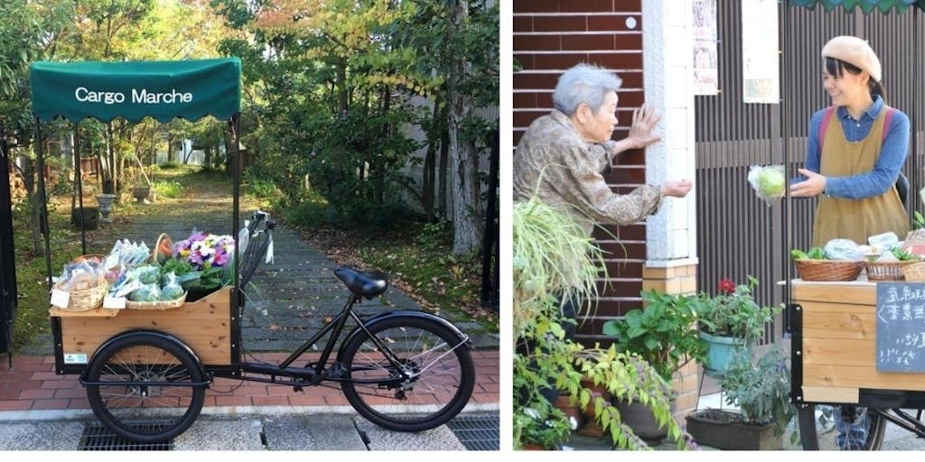2019/03/31少子高齢の進む市街地にベルを鳴らしながら走る"カーゴマルシェ" 三輪自転車で買い物難民に新鮮で安心な野菜や花を定期的にお届けしています。週1~2回なので使わない日を利活用するアイデアとやって頂く方を募集~! 同時に現在行っている野菜・花の販売をやってみたい方も募集~!