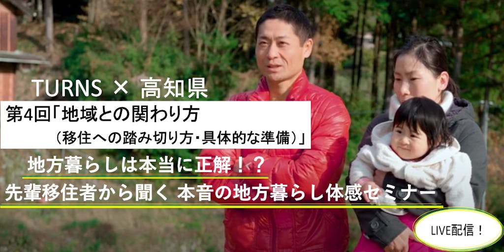 2021/01/27雑誌『TURNS』と高知県がコラボして、先輩移住者が地方暮らしの魅力や本音をお伝えする全10回のセミナーを、ライブ配信いたします。 毎回テーマに沿った先輩移住者にご出演いただき、地方の暮らしや働き方まで、ざっくばらんに本音を語り合います。 セミナー後には、ゲストの先輩移住者の本音を直接聞ける「質問タイム」もあります!