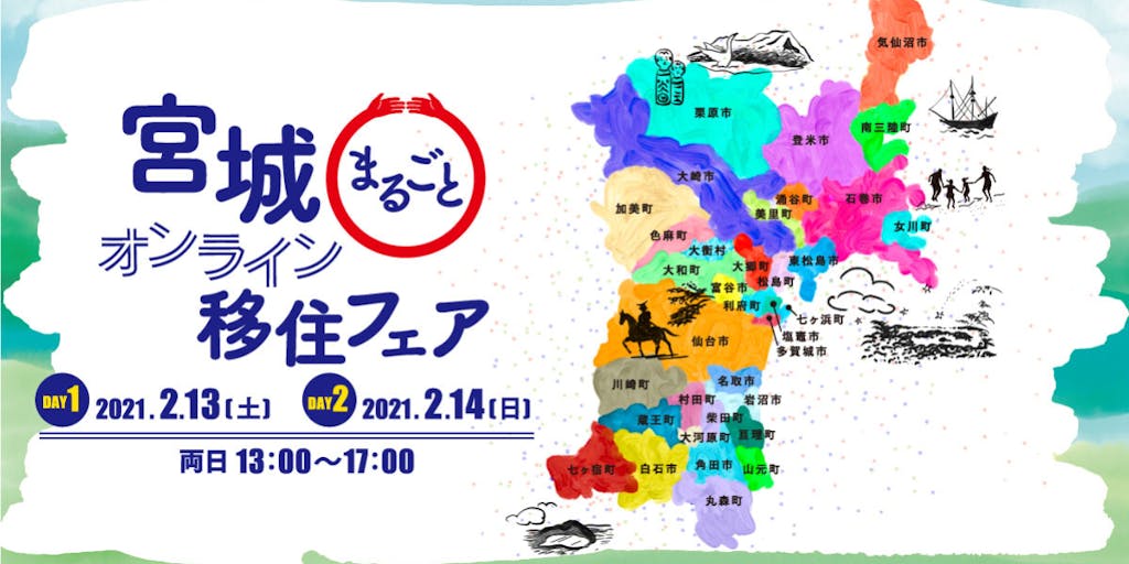 2021/02/14宮城県では史上初!県内の全35市町村が参加する「オンライン移住相談会」を2月13日、14日の2日にわたり、オンラインで初開催します。 東京から約90分の仙台市をはじめ、移住者が増え盛り上がりを見せる沿岸部に季節問わず様々なアクティビティが楽しめる山間部と、表情豊かな宮城県の魅力を体感しつくそう! 震災から10年を迎え、復興とますますの発展を遂げている宮城県の“今”を知りに来ませんか? 事前のブース予約で「宮城まるごと味わいセット」をご自宅にお届けします!
