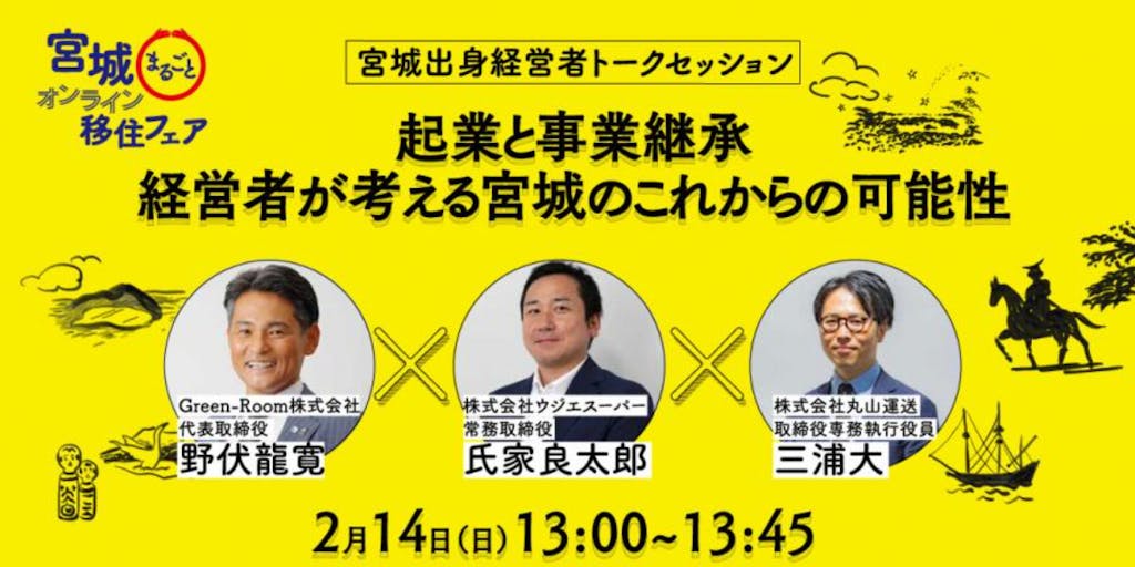 2021/02/14宮城県内の35市町村と直接つながれる!移住フェア内のステージコンテンツ視聴者募集 地方で事業を起こしたい、事業継承を検討している人、必聴! 「宮城まるごとオンライン移住フェア」内で宮城県を軸に事業を展開する企業の経営者3名によるトークセッションが実現。 事業継承者と起業家の視点で、宮城の未来とそれぞれの事業の展開や構想について、ざっくばらんにお話いただきます。 震災から10年が経過する宮城県で、新しい事業の種を、ぜひ見つけに来てください。