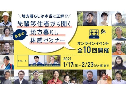 2021/02/23雑誌『TURNS』と高知県がコラボして、先輩移住者が地方暮らしの魅力や本音をお伝えする全10回のセミナー & 交流会を開催します。 毎回テーマに沿った先輩移住者にご出演いただき、地方の暮らしや働き方まで、ざっくばらんに本音を語り合います。 ゲストの先輩移住者の本音を直接聞ける「質問タイム」もあります!