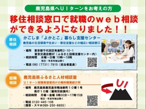 新型コロナウイルスの影響により、県を越えた移動がなかなかできない状況が続いています。 鹿児島に移住を検討したくても、訪問できない。 少しでも、移住を検討するに当たっての情報をお伝えしたいと考え、東京の有楽町にある「かごしま『よかとこ』暮らし支援センター」で就職のweb相談ができるよう体制を整えました。 窓口に来所された方は、鹿児島にあるUIターン就職希望者向けの無料職業紹介所「かごしまふるさと相談室」へタブレットを利用した就職相談ができますので、ぜひご活用ください。