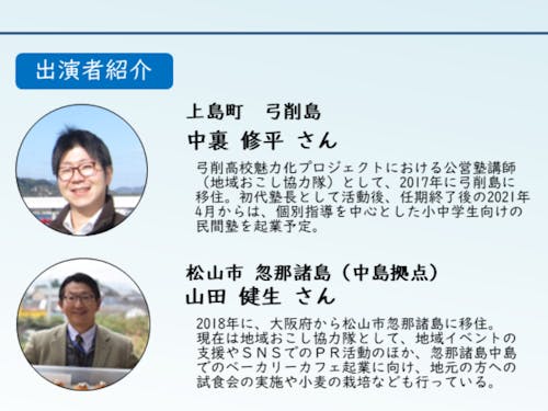 2021/03/12瀬戸内海に面し、温暖な気候や豊かな自然に恵まれた愛媛県は、移住先として近年人気が高まっています。瀬戸内海に浮かぶ島々で暮らす2名の移住者の、リアルな体験談を聞いてみませんか。オンラインでご自宅などからお気軽に参加いただけます♪