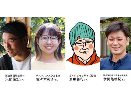 モデレーターは、アートやデザインの視点から田舎の新たな可能性を探る西会津国際芸術村ディレクターの矢部佳宏さん。ゲストのIターン移住者であるゲストハウスひとときの佐々木祐子さんには、移住についての実際と、テントサウナなどの冬の遊びについて、西会津町出身で役場職員でありながら、日本ジョセササイズ協会理事を務める斎藤善行さんには、ジョセササイズ*やスノーウォーキングなどのアクティビティについて、西会津町商工会青年部部長の伊勢亀さんには、ご当地ヒーローや名物味噌ラーメン、名所のライトアップなどの取り組みについてそれぞれ語っていただきます!