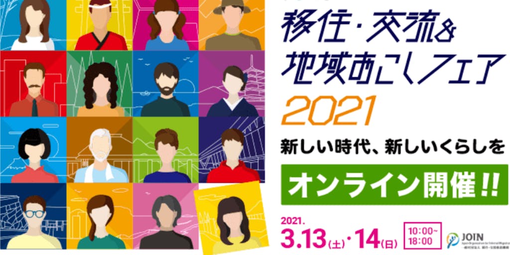 ・スケジュール: 2021年3月13日(土)10:00~18:00 2021年3月14日(日)10:00~18:00 ■JOIN移住・交流&地域おこしフェア2021 https://join2021.jp/