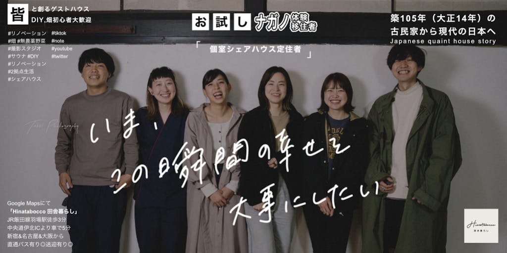 2022/01/02わたしたちは「築105年の古民家から現代の日本へ」をテーマに古民家暮らしに役立つコト・モノ・体験を発信しています。 社会問題である「空き家の増加」に着目し、辰野町の古民家再生しています。耕作放棄地の畑利用や、古民家DIYを行って様々な形に変化させます。活用方法として現在はシェアハウス、無料撮影スタジオは進行中、この来年にはゲストハウス、蔵カフェ、サウナ、Youtube発信などの開業を考えています。現在105名の方にお手伝い頂きお子様から学生、子育て世代、40代の方までお手伝い頂きました。シェアハウスについては5名在住中。シェアハウスについては残り1部屋あるため、お試しナガノや1日移住体験も大歓迎です。南箕輪村もシェアハウス開業をしております。就労者によるボランティアスタッフそして更にたくさんの方に関わって頂きたいと考えております。1mmでも気になる方は「興味ある♥」、更にメッセージ付きだと嬉しいです。