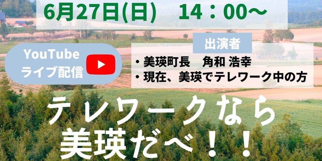 2021/06/27現在、美瑛町でテレワーク生活を送っている方と、先輩移住者でもある角和町長が「テレワークなら美瑛だべ!!」をテーマに語り合います。 「実際どうなのよ?」と感じているそこのアナタ! ライブ配信中に質問に答えるコーナーも用意しています。ぜひ参加ください。