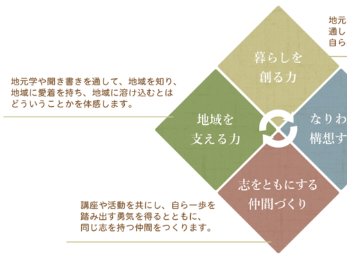 あなたは、どこで、誰と、何をしたいと考えていますか。漠然とした「想い」を、この塾に通いながら、少しずつカタチにしていきましょう。夢と志ある皆さんの参加をお待ちしています。