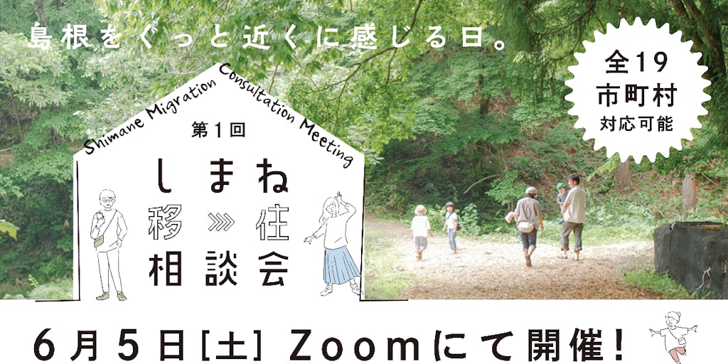 2021/06/05今年度最初の移住相談会イベント“第1回しまね移住相談会”をオンラインにて開催いたします♪ 相談会では、19市町村担当者から直接魅力をご紹介いたします。 ふるさと島根定住財団の相談員も総合相談でお待ちしていますので、ぜひお申込みください。 イベント当日は相談だけでなく、市町村の魅力を紹介する座談会も行います。 島根暮らしのこと、仕事のこと、地域のこと、この機会に何でもご相談ください。 オール島根で皆さんのご参加をお待ちしています♪