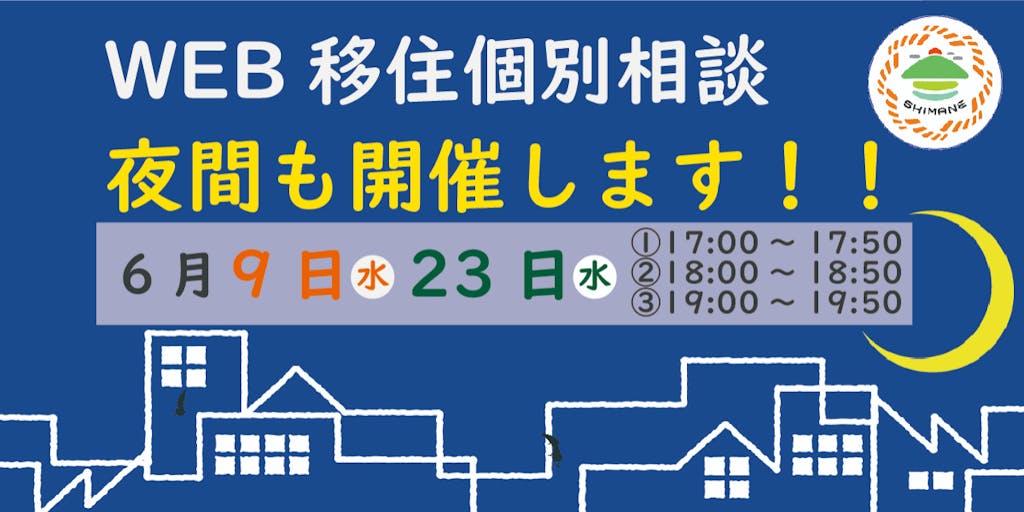 2021/06/23島根県では、ご自宅やインターネット環境のある場所から、相談員へ直接移住相談ができる”WEB移住個別相談”を実施しております。 6月も2日間、夜間相談日を設けています。 お仕事で夜間しか相談時間をつくるのが難しい方など、ぜひご利用ください! 気楽に島根についてお話しませんか? 皆さんのお申し込みをお待ちしています♪