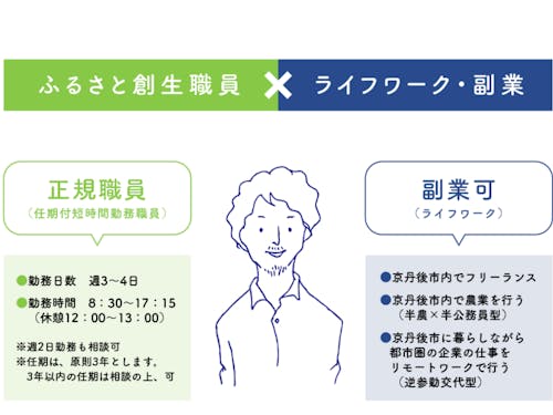 〈働き方の具体例〉 週4日:ふるさと創生職員 + 週1日:京丹後市内でフリーランス 週3日:ふるさと創生職員 + 週3日:京丹後市内で農業(半農×半公務員型) 週3日:ふるさと創生職員 + 週2日:都市圏の企業の仕事をリモートワーク(逆参勤交代型)