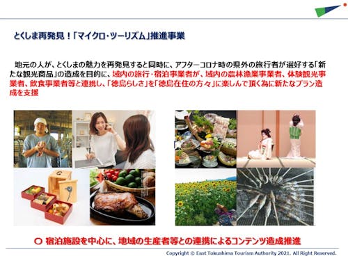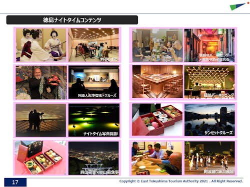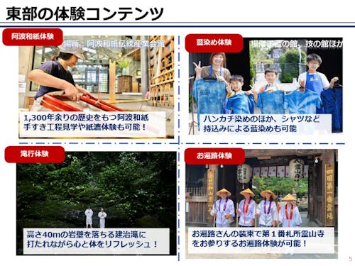 ・徳島東部には、豊かな自然が多く、特に旧遍路道をはじめとして、未舗装の古くから存在する古道があり、トレイルコースや、神社・仏閣の伝統行事といった、体験型観光コンテンツとして国内外から観光客を呼び込むことができる魅力的な素材があります。 ・南海道に位置し、海運の発展により明治初頭に栄華を誇った徳島には、その面影が多く残っており、水資源が豊富な地域です。 ・江戸時代より藍商人によって発展した徳島の夜の文化の歴史を感じさせる街で、四国最大の歓楽街であった街並みを彷彿とさせる面影が随所に残っています。 ・阿波藍や和紙といった、古から今に伝わる職人の本物の技を体感し、その商品を購入したり、関西の料理人が使用する徳島の食材の数々を、その産地で“獲れたて” ならではの味を体感できる観光コンテンツとなりうる素材が数多くあります。