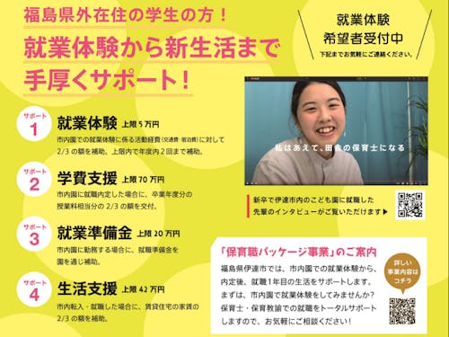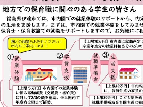 ★就職活動前に、園で就業体験をしてみたい学生の方、ぜひご利用ください。 伊達市の子育て支援の概要:https://www.city.fukushima-date.lg.jp/site/iju/kosodate.html