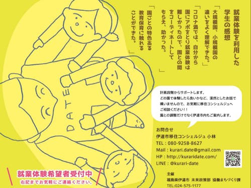 事業の詳細は、伊達市移住定住サブサイト(https://www.city.fukushima-date.lg.jp/site/iju/41560.html)へ