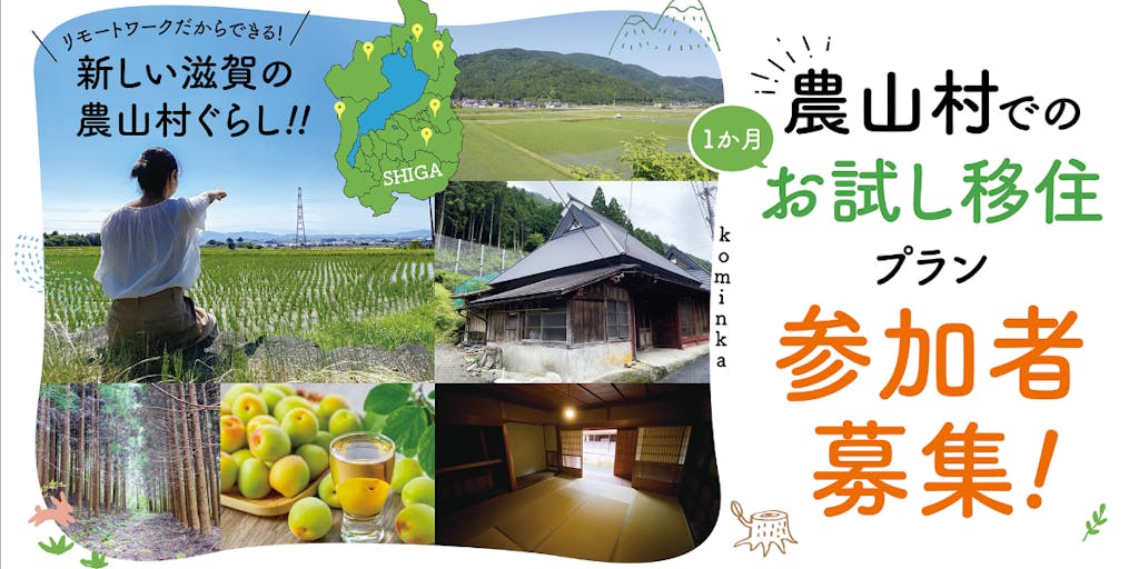 2021/08/31山や川に囲まれた緑豊かな場所で暮らしてみたいけど、いきなり移住するのは少し心配・・・。そんな方に朗報です!滋賀の農山村での暮らしをお安く体験できる、約1ヶ月間の「農山村お試し移住プラン」の参加者募集を始めました!