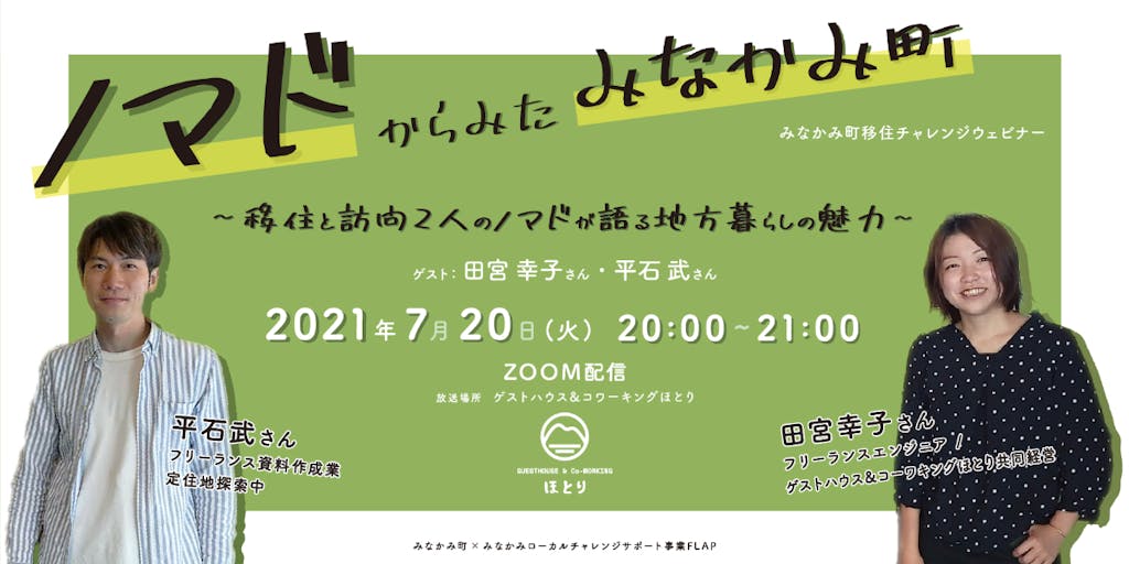 2021/07/18こんにちは!今年も昨年に引き続き、移住の傾向は続いている、むしろ進んでいるように感じている移住の現場、みなかみ町移住支援団体FLAPの鈴木です。今年もウェビナーを開催いたします! 今回は「ノマド」にフォーカス! 現在、日本全国で働く場所・時間にとらわれない「ノマドワーカー」が増えている一方で、地域に関わりたい・根ざしたい人も増加しています。様々なライフスタイルが始まる現在で、自分の理想の生き方・暮らし方はなにか?みなかみ町に縁を得た二人のノマドワーカーをお呼びして、風の人・土の人2つのポジショニングと地域との関わり合い、そして理想の生き方について、みなかみ町とつながった二人の「ノマドワーカー」のお話をお聞きします。 一人は「田舎でゲストハウスをやる」。移住での憧れでいつも上位に上がる、そんな事業をみなかみ町に移住して半年で始めた田宮幸子さん。自分にとっての“豊かな暮らし”を求めて地方を旅し、みなかみにたどり着き、現在はゲストハウス&コワーキングスペースの経営をしています。 もう一人は、「自分らしい暮らしを実現できる定住地を探す」平石武さん。都内の仕事をオンラインでこなしながら、全国各地を1ヶ月程度の滞在をしながら、自分にマッチする地域を探しています。 当日はタミヤさんも携わる、新しく町に誕生したノマドの拠点「ほとり」で開催します。今最も旬な働き方をされる二人にどんどん聞いちゃいましょう!