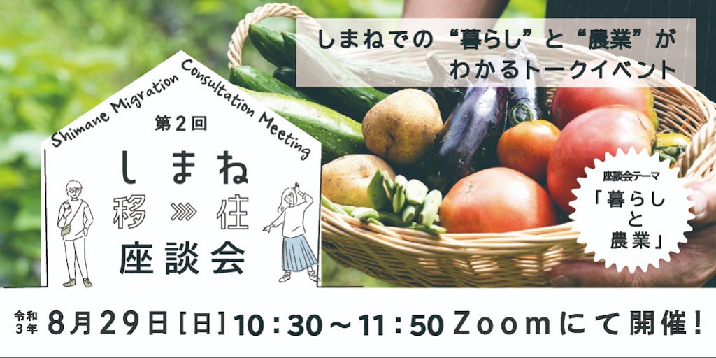 2021/08/29移住相談イベント“第2回しまね移住座談会”をオンラインにて開催いたします♪ 2回目になる今回のテーマは「暮らしと農業」。 各市町村担当者から“各市町村の暮らし”や“農業の支援制度”“主な農産物”などをお話しします。 ご参加いただいた皆様からの質問にもお答えします! 街での暮らしが気になる方も、農業に興味がある方も、ぜひご参加ください!