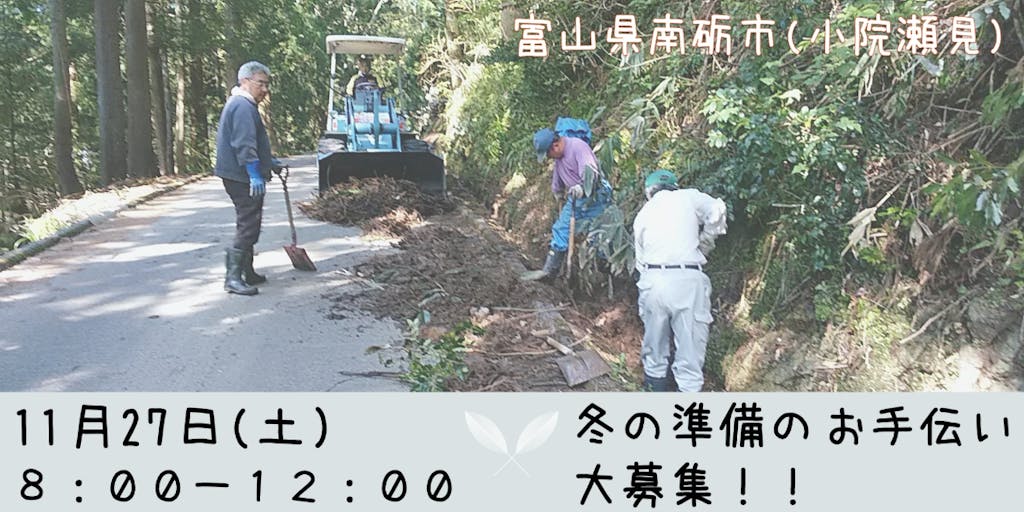 2021/11/27雪の多いここ富山県南砺市小院瀬見は、冬の間市街へ通じる1本しかない道路に雪が溜まらないように水を流して消雪するため、谷から引いた用水路の土砂や枯れた枝葉を除去する「江ざらい(えざらい)」という行事があります。 他の集落の住民連携による共同活動として「西太美地域地域おこし支援隊」を結成し、春の稲作のために水を準備するのと同じくらい大切であり、「江ざらい(えざらい)」を春と秋に行っています。