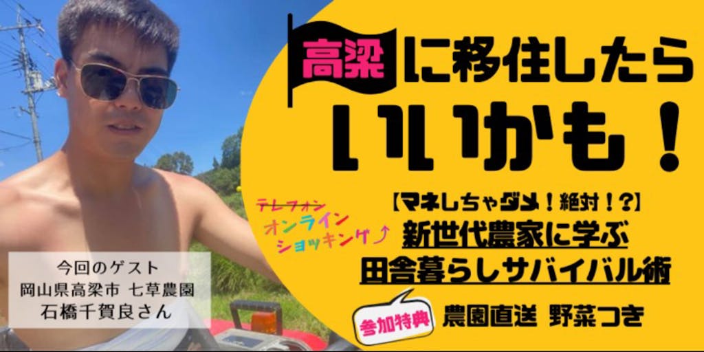第一回のゲストは高梁市で七草農園という農家をされている「石橋ちから」さん。 【石橋さんについて】 令和の裕次郎こと石橋ちから。東京生まれ、東京育ち。 「自給自足」を達成するために自給自足の根本である農業を!と、大学卒業後そのまま「農」の世界へ。 2018年両親と共に岡山県高梁市に移住し現在移住3年目。農家として野菜を育て出荷するだけではなく、野菜を最大限に活用するための料理方法を提案するなど、農家の枠に捉われないNEO農家として挑戦中。 ・2020年にはNKHの密着ドキュメンタリー「ノーナレ」に出演 ・2021年にはクラファンで「中国山地の空き家を農業交流空間に」を達成