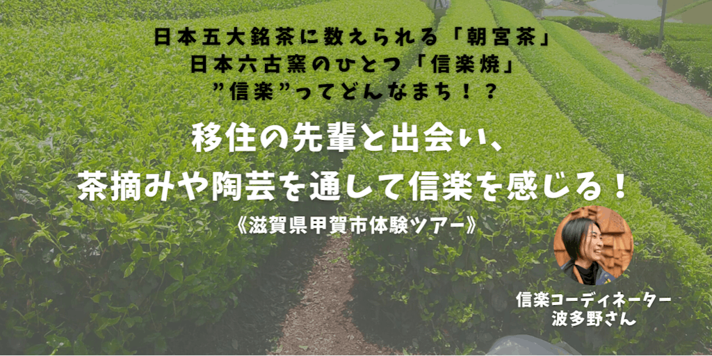 産業の中心であるお茶や陶芸などの体験や、地域で活躍する方と出会い、話を聞く地元人・移住者目線の情報ギュッと詰め込んでだ1泊2日になっています。 1日当たり6000円の謝礼もあるので、おトクに甲賀市を満喫できますよ◎