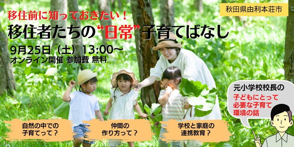 2021/09/15地方で子育てするってどんな感じなんだろう。そんな疑問を秋田県由利本荘市に移住した県外出身のママたちが、いつもの日常の暮らしの話を通じてお伝えするオンライン交流会。「自然の中での子育てって?」「教育レベルはどうなの?」「相談できる仲間の作り方は?」そんな疑問に秋田県が第2の故郷となったママたちがお答えします。地方移住のいいところも、そうでないところも「これ、移住前に知っておきたかった!」という話が盛りだくさん! そして、30年以上子どもたちの教育に関わってきた元小学校校長先生の「五感が育つ秋田の子育て環境」をテーマとした講演も聞きどころ満載。秋田の豊かな自然が、子供の五感と生きる力を育むことができること。そして自然の中に、子育てのヒントとなる学びがたくさんあることなど子育てのためになる内容です。地方で子育てをしてみたい皆さんにお出でいただきたい交流会です。