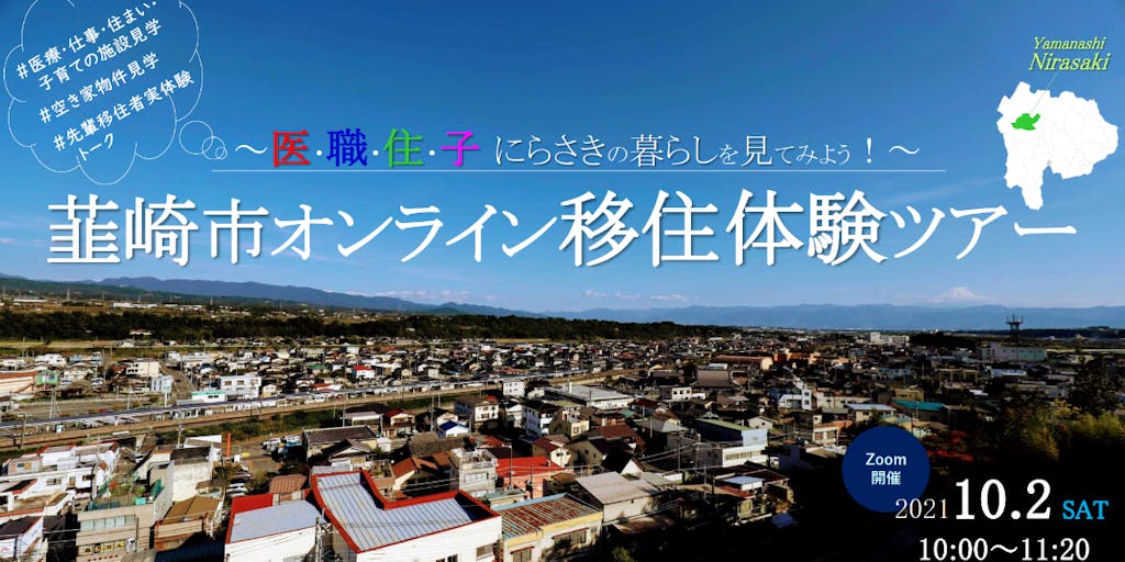 2021/09/29「地方での暮らしってどんな感じなんだろう?」「韮崎市ってどんなまちなんだろう?」 「移住に興味はあるけど、新型コロナの影響で、なかなか現地まで相談に行けないな…」 コロナ禍で韮崎を訪れることが出来なくても、このオンラインツアーで韮崎の暮らしが体験出来ます。今回は医療、職業、住まい、子育てにスポットを当てて皆様をご案内いたします。ぜひご参加ください。