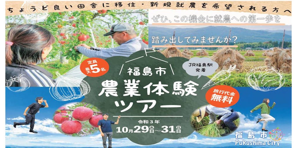 2021/09/28東京駅から福島駅まで新幹線でおよそ80分と恵まれた立地条件にある福島市。 そんな福島市は、全国有数のくだものの産地で果樹栽培が盛んな地域であるとともに、稲作も盛んな地域でもあります。 都市と自然のバランスがとれたちょうど良い田舎で農業を体験してみませんか? 今回の体験ツアーでは、稲刈りやりんごの収穫をメインに実施予定です! 市内の農家さんのもとで、実際に様々な農作業を体験することで、福島市での就農ついて具体的にイメージできる絶好の機会です。 また、農家さんに直接相談できる時間もご用意しています。ぜひ、この機会に就農への第一歩を踏み出してみませんか? 気になった方は、ぜひ「興味あるボタン」を押してください!