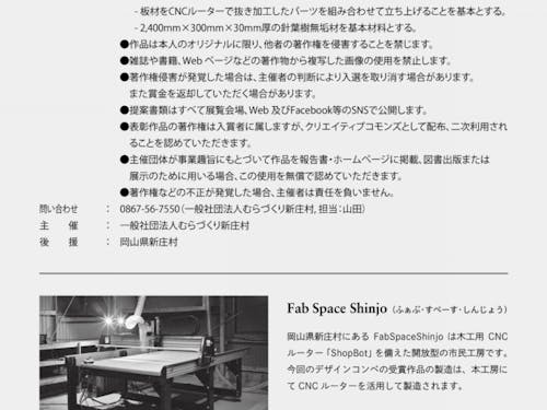 〔 賞 〕 ●最優秀賞(1点) 賞金20万円、実際に製作し一定期間岡山県新庄村内の森林に設置 ●優秀賞(1点) 賞金5万円 ●学生賞(3点) 賞金1万円