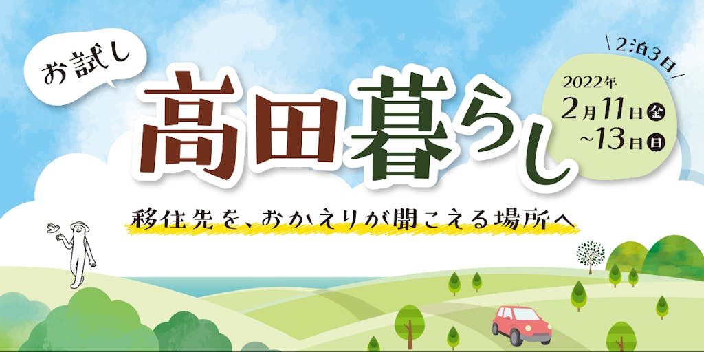 ①2/5(土)13:00~15:00 「0日目 オンライン交流会」 ②2/11(金・祝)~2/13(日) 「お試し高田暮らし」 . ▼詳細スケジュール 下記チラシをご参照ください。 https://drive.google.com/file/d/1DYwNaPHoET6Mo3bsPeeU4fi1_q-EzDoO/view?usp=sharing . ◆少しでもご興味がありましたら、参加の可否を問わず、ぜひ「興味ある」ボタンをクリックください! . ◆「すぐに参加を申し込みたい!」という方は、下記から参加のお申し込みをお待ちしております。(所要時間:数分) https://forms.gle/3Hz1wEVGkhc39zxT8