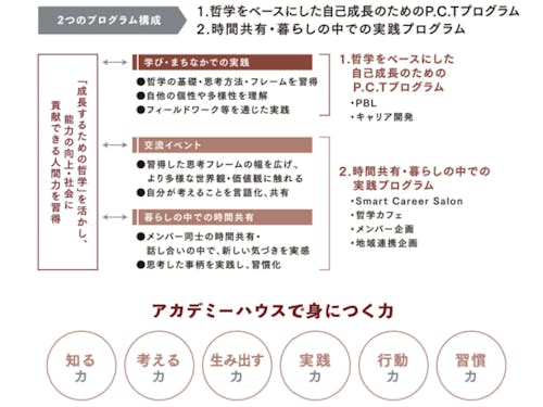 物事の変化が加速していく、これからの時代。ここ山口で、予測できない事柄や社会情勢に立ち向かえる次世代のリーダーを育むため、本施設の独自プログラムである、哲学をベースとした時間共有型のキャリア開発「P.C.Tプログラム(Philosophy-based Career Development Through Time Sharing)」を提供します。 日々の共同生活や定例イベント・交流会の企画・開催等による他者・地域との共生・関わり、専門家がバックアップする「PBL(Project Based Learning)/課題解決型学習」やキャリア開発プログラム等を通して、哲学的思考や多様性の尊重など、様々な経験やスキルの獲得を目指し、自己肯定感・自己効力感を高め、人間性を育み、人生の充実につなげていきます。
