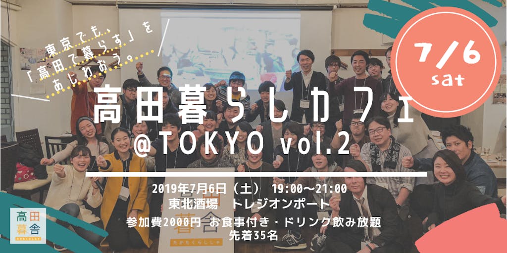 ◼︎タイトル: 高田暮らしカフェ@東京 vol.2 ◼︎日時: 2019年7月6日(土)19:00-21:00(開場は30分前) ◼︎場所: 東北酒場トレジオンポート 東京都港区赤坂3-12-18 第8荒井ビル2F https://tregion-bal.com/tregion-port/