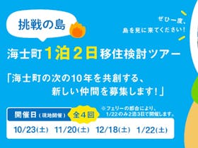 ■海士町移住検討ツアーについてお知らせ 令和3年度海士町職員(海士町魅力化推進枠)採用選考試験の受験や海士町での移住を検討されている方を対象に、海士町移住検討ツアーイベントを行います。 実施日:【全4回】10月23日(土)、11月20日(日)、12月18日(土)、1月22日(土) ※それぞれ1泊2日(1日目13時頃〜2日目9時頃)となります。 海士町移住検討ツアーについての詳細・参加申し込みはこちらからお願いします。 → https://ama-recruit.peatix.com/