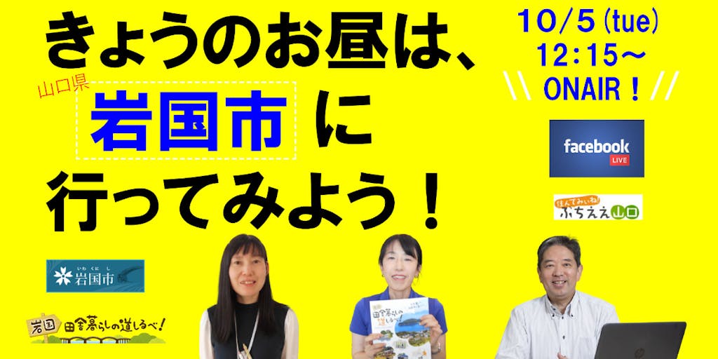 2021/10/05山口県内で移住サポートをしてくれる相談窓口や相談員の皆様を紹介しながら、 県内の個性的な市町の魅力をお伝えする、お昼の名物Facebook Live、 「きょうのお昼は、〇〇に行ってみよう!」
