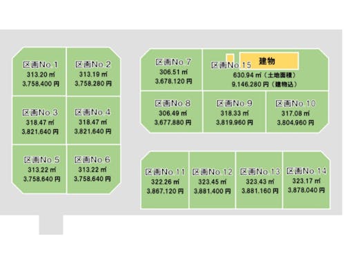 【区画数・土地面積・分譲価格】 15区画、306.49㎡~630.94㎡、3,677,880円~9,146,280円 ※ 区画ごとの面積や価格については、区画図を参照してください。 ※ 区画№15については、既存建物(H12~13築。延べ床面積127.51㎡)があり、価格は当該建物の価格を含みます。