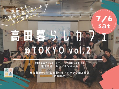 第二部 高田暮らしカフェ@東京 vol.2 7月6日(土)19:00~21:00(18:30開場) 東北酒場トレジオンポート(赤坂) も同日開催致します。 こちらは交流メインとなっておりますので、ぜひ合わせてご検討ください!(どちらかのみの参加も可能です) 詳細はこちら https://smout.jp/plans/516