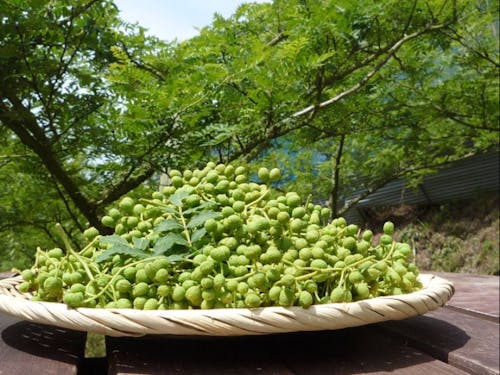 山椒は3~4月に若葉や花をつけ、5月中頃から実の収穫ができるようになります。8月下旬まで収穫は続きますが、収穫する時期によって身の状態が異なるため、その時々によって加工法が変わります。