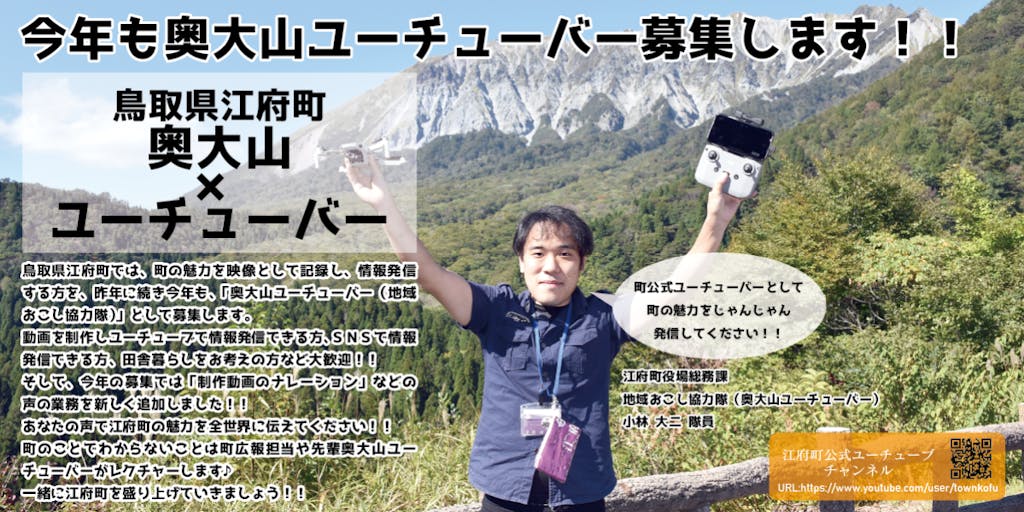 鳥取県江府町(こうふちょう)では、町の魅力を映像として記録し情報発信する方を昨年に続き今年も「奥大山Yotuber(地域おこし協力隊)」として募集します。 動画を制作しユーチューブで情報発信できる方、SNSで情報発信できる方、田舎暮らしをお考えの方など大歓迎!! そして、今年の募集では「制作動画のナレーション」などの声の業務を新しく追加しました!! あなたの声で江府町の魅力を全世界に伝えてください!! 町の事でわからないことは町広報担当や先輩奥大山ユーチューバーがレクチャーします♪ 一緒に江府町を盛り上げていきましょう!!
