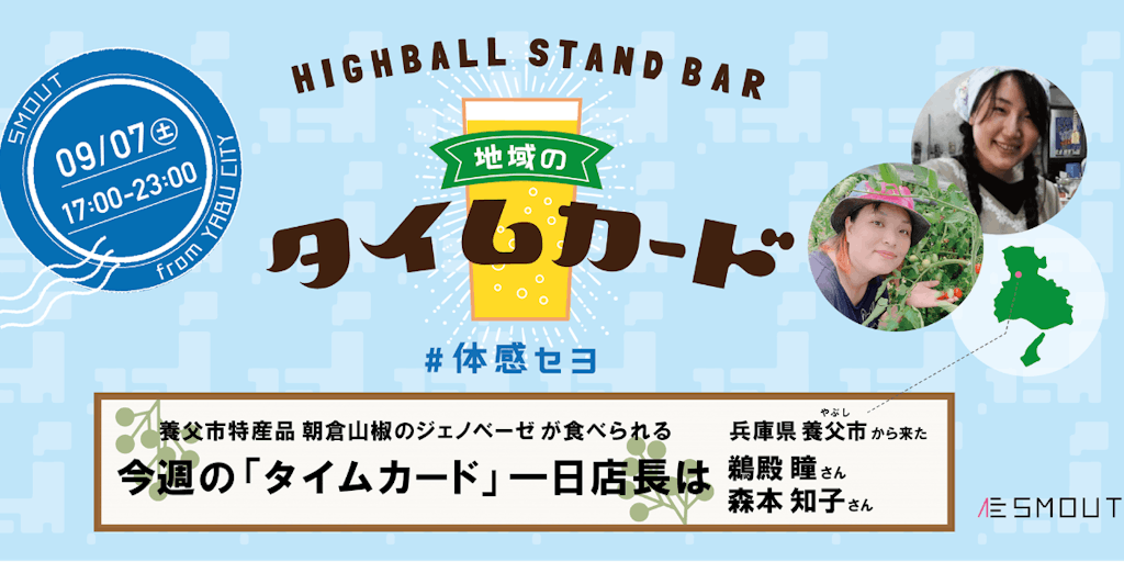 鎌倉の「まちの社員食堂」通常は鎌倉で働く人だけが使える社員食堂ですが、土曜日の夜だけ、誰でも立ち寄れるタイムカードハイボールバーになります。 今回、SMOUTと養父市とのコラボ企画で 地域のタイムカード 1日ハイボール店長 【養父市編】を実施します!