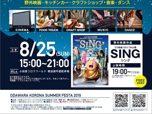 場所:小田原コロナワールド(鴨宮側駐車場) 神奈川県小田原市前川219-4 日時:8月25日(日)※小雨決行 時間:15時~21時予定