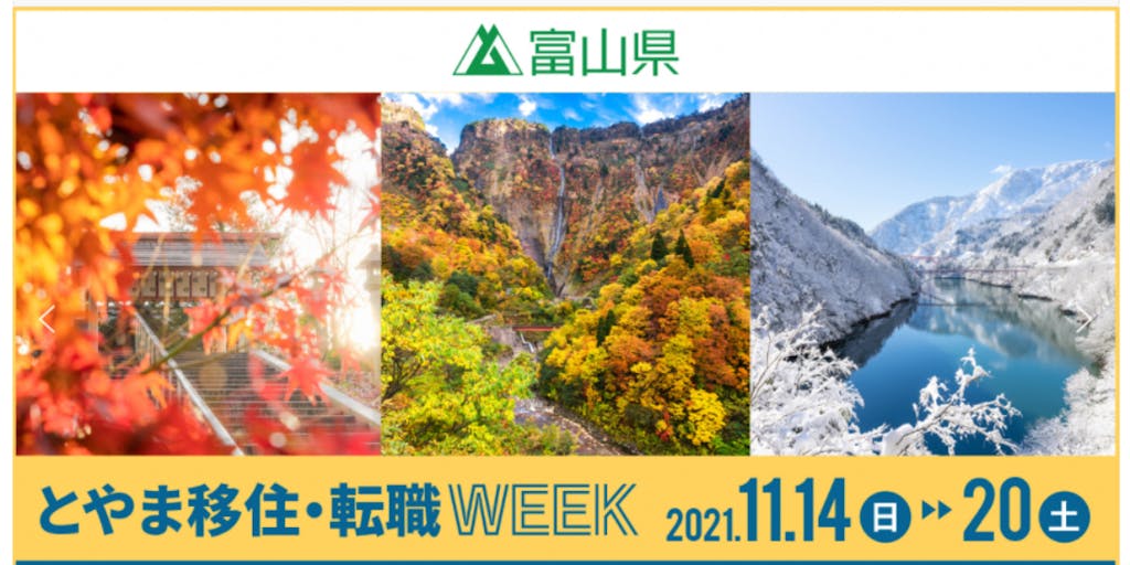 2021/11/19富山での暮らし方、働き方、楽しみ方を知ることができるイベントをオンラインで1週間開催します。セミナーや座談会など、県内市町村・先輩移住者の方々と一緒に富山県の魅力を感じてみませんか?皆さまのご参加をお待ちしております!