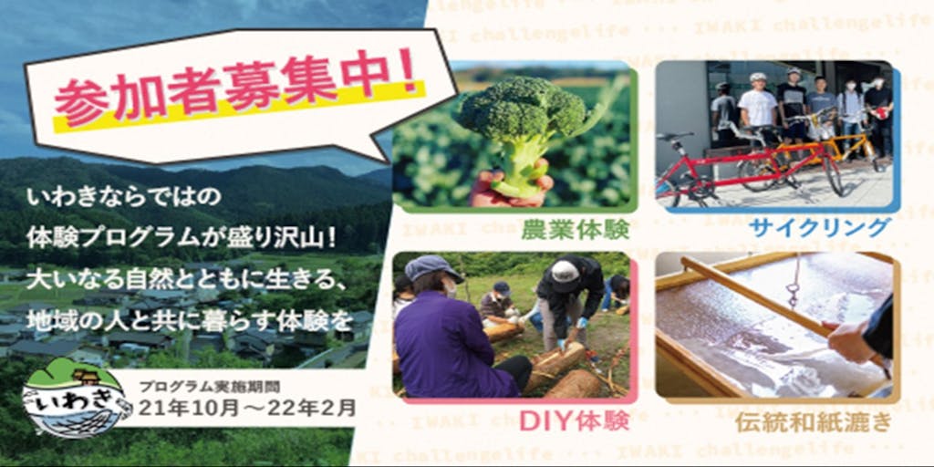 【体験プログラムの例】 ・[アウトドア&伝統工芸体験]自然の中でキャンプ&伝統工芸体験! ・[いわきで農業体験]伝統野菜・里芋「長兵衛」を収穫!サスティナブルな農業を体験しよう! ・[モノづくり好き集まれ!]地域コミュニティ基地をDIY!コミュニティデザインやまちづくりを体験しよう!! ・[地域の魅力発信!]いわき市田人町のMAPづくりプログラム。地域の人たちと町を巡り、町の魅力発掘・発信に挑戦しよう! ・[サイクルツーリズムvol.2]いわきの建築と人をめぐりながら散走!建築物と人の面白さに触れて自由にサイクリングコースを作成しよう!