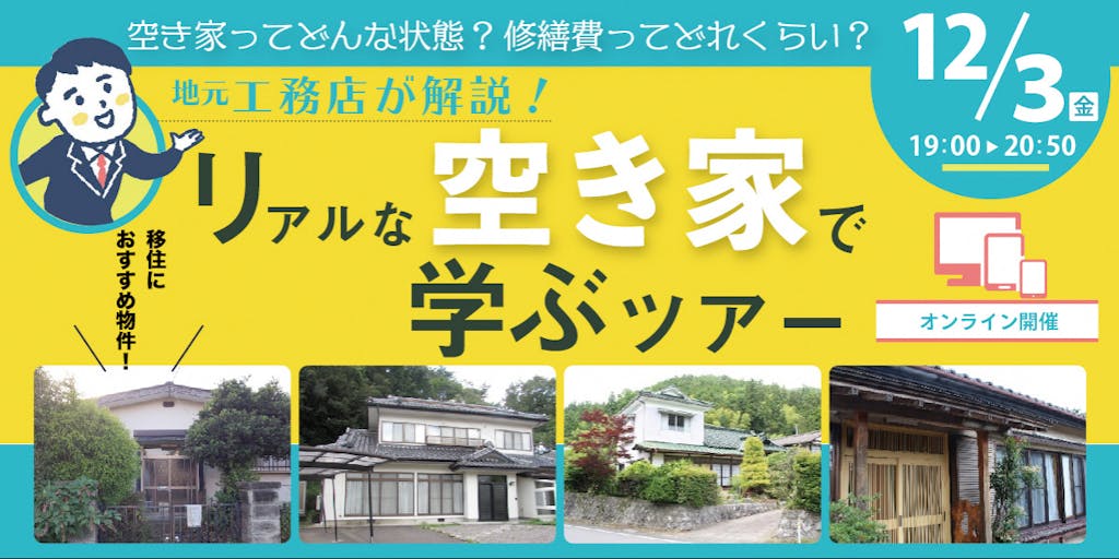 移住する際の住居の選択肢の1つとなる「空き家」。 一口に空き家といっても、広さ・状態・修繕の必要性・売買か・賃貸かなど様々・・・ 今回はそんな「空き家」について、地元の工務店の方に実際の物件を解説いただきながら、学ぶセミナーです。